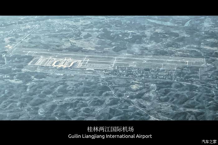 经过不到3个小时的航程,客机开始下降高度准备降落。从侧窗可以鸟瞰到桂林两江机场,此时我们的客机北向南正处在三边的位置上。