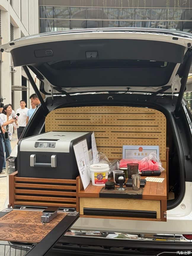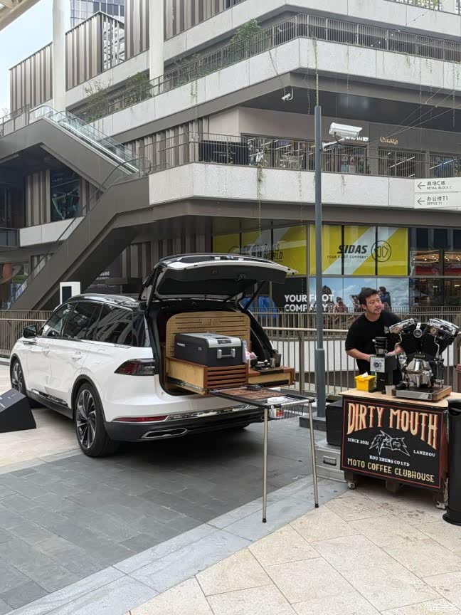 我个人感觉这次最好玩的还是林肯弄的这个“后备箱咖啡馆”,创意挺新潮的,也是展现了飞行家这车的另一种生活方式,直接后备箱改造成户外咖啡站,现场还能喝。工作人员说开后备箱的时候空悬会自动降低,拿取东西比较方便,也是这座“移动咖啡厅”的“基础”。