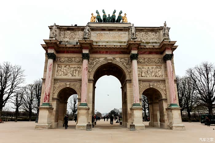 凯旋门:巴黎凯旋门,即雄狮凯旋门(Arc de triomphe di l'Étoile),位于法国巴黎的戴高乐广场中央,香榭丽舍大街的西端。凯旋门正如其名,是一座迎接外出征战的军队凯旋的大门。它是现今世界上最大的一座圆拱门,位于巴黎市中心戴高乐广场中央的环岛上面。这座广场也是配合雄狮凯旋门而修建凯旋门高49.54米,宽44.82米,厚22.21米,中心拱门高36.6米,宽14.6米。在凯旋门两面门墩的墙面上,有4组以战争为题材的大型浮雕:"出征"、"胜利"、"和平"和"抵抗";其中有些人物雕塑还高达五六米。凯旋门的四周都有门,门内刻有跟随拿破仑远征的386名将军和96场胜战的名字,门上刻有1792年至1815年间的法国战事史。
