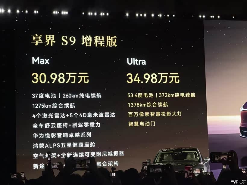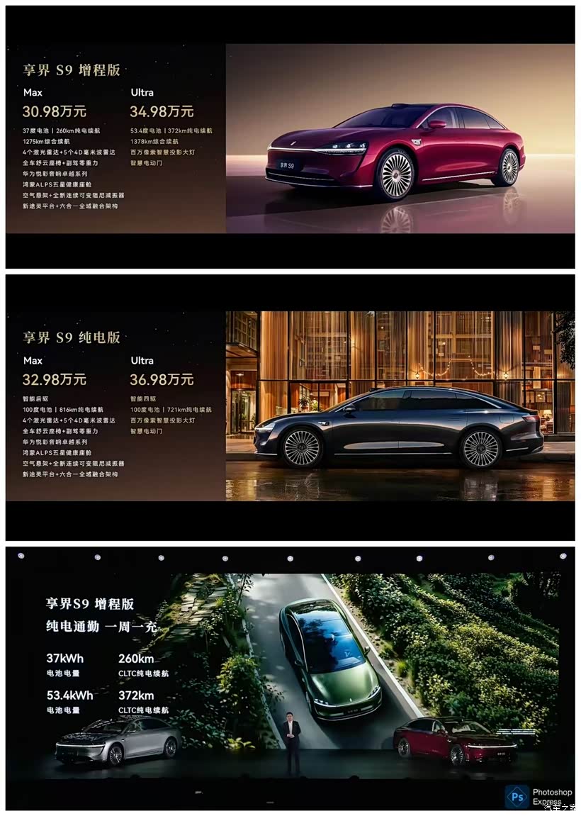 新款享界S9价格公布,增程版售价30.98万至34.98万元,纯电版售价32.98万至36.98万元,和老款差距不大。