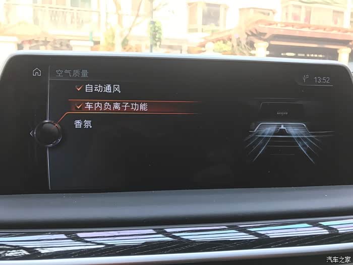 空气净化功能。生活在中国,尤其是帝都,空气质量是个很大的问题,买车时特意问了4s这车是否有空气净化功能,答曰:有。但是出于保险,自己还是实测了一下。提车第二天,我就把我沉睡了近1年的空气果充好电,到车里实测。当时测试车内pm2.5为8,打开车门,车外pm2.5为300。净化效果还是不错的。另外,这几天研究iDrive系统,发现还有隐藏的负离子功能和间接通风功能,大家可以试着打开。