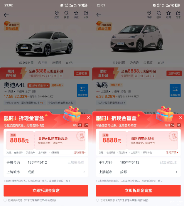 ,购车领现金补贴200-3000元不等,此次高额补贴车型涉及市售超1000款主流车型,领取次日-15日内上传发票交强保单有效,全国可享,领完即止,领红包选择意向较高购买门店,不确定门店的,可勾选多个门店,选错可取消重新领取,羊毛党千万不要错过哦!