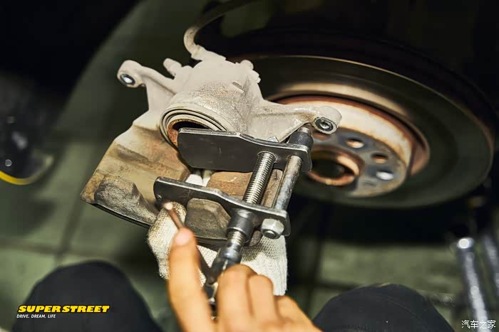 更换时需要使用专用工具将卡钳活塞顶到里面,这样才能便于安装卡钳。