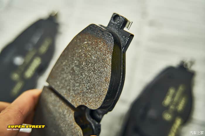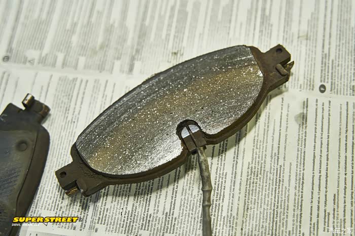 这是从拆下来的原厂刹车片,看厚度也快要磨到感应线了。