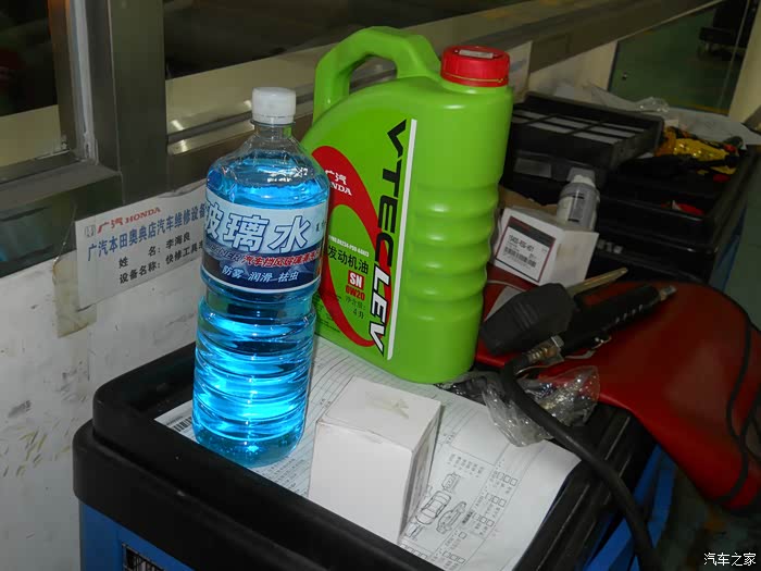 这次保养需要更换的东西。机油、滤芯、玻璃水。其他的就是检查项目了,比如:大灯、雨刷什么的