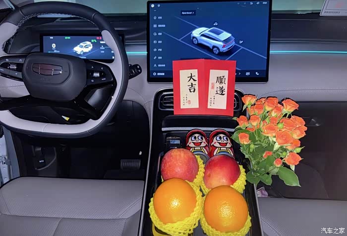 作为女生,从我个人角度来说,还是很喜欢仪式感满满的场景,这个是之前简单布置的,红包是从家里拿的,苹果和橙子都是去超市挑选的,苹果一个个圆润饱满,色泽红润得如同少女羞涩的脸颊,寓意着出入平平安安,希望每一次出行都能顺顺利利、平平安安,橙子则散发着清新的果香,金黄的外皮在阳光下闪烁着诱人的光泽,寓意着心想事成,仿佛把所有的美好期许都装进了这小小的果实里,还有那束花,哈哈,其实是我从家里花瓶里“借”来的,原本静静插在花瓶里的花朵,此刻被我重新搭配组合,瞬间焕发出不一样的生机与魅力,每一片花瓣都娇艳欲滴,仿佛在诉说着浪漫的情话,当然,还少不了我最爱的旺仔牛奶,那熟悉的包装,那甜甜的味道,总能勾起我内心深处最温暖的回忆,给这份仪式感增添了一份别样的甜蜜,简单布置的仪式感也让我开心很久,希望这个车可以给我们家带来很多的好运