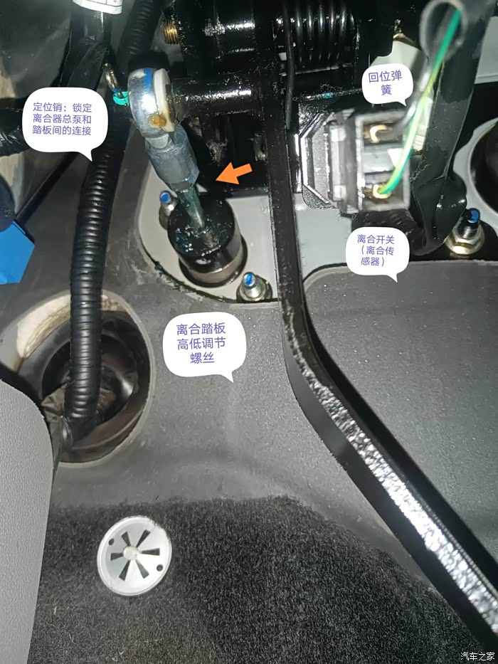 离合器踏板处异响:1、估计是回位弹簧处响声,已抹HPR高温润滑脂(黄油、蓝色),也抹在离合开关触点、离合器总泵推杆处。