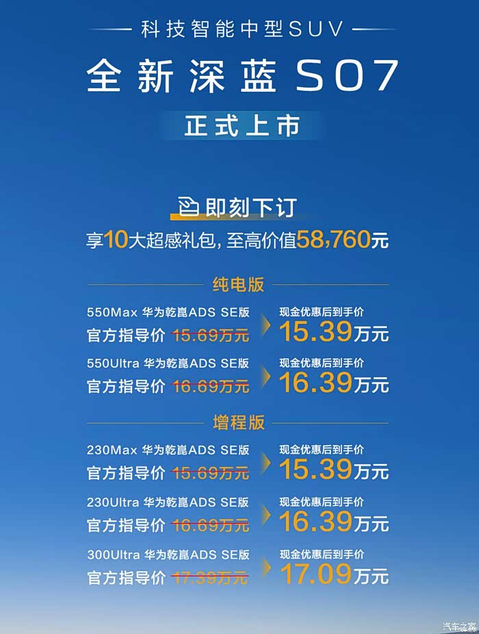 一开始想订 S05,后来发现 S07 只贵 1.8W,但空间更大,还带铝合金羊角 + 多 H 臂、FSD 可变悬架(底盘质感拉满),关键智驾直接升级成华为乾崑 ADS SE—— 这 1.5W 花得太值了(9月19月正式上市现金礼再优惠3000元)!