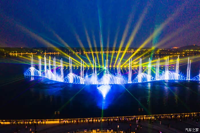 当夜幕降临,华灯初上,南湖又是另一番模样,丹凤朝阳广场,古铜色雕塑上“春夏秋冬”四季变幻。在广场南侧龙泉湾湖面上,是水精灵的秀场。长220米,宽81米的舞台上,湖水随着音乐、随着七彩的镭射光,律动摇摆,身姿扶摇变换;长卷水幕电影、艺术灯光、多变水形在高科技的助力下,为人们呈现出完美的视觉盛宴。
