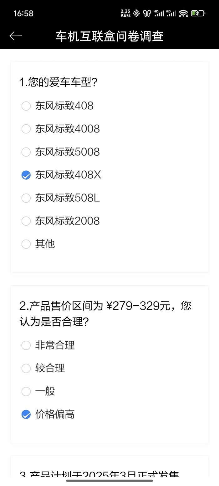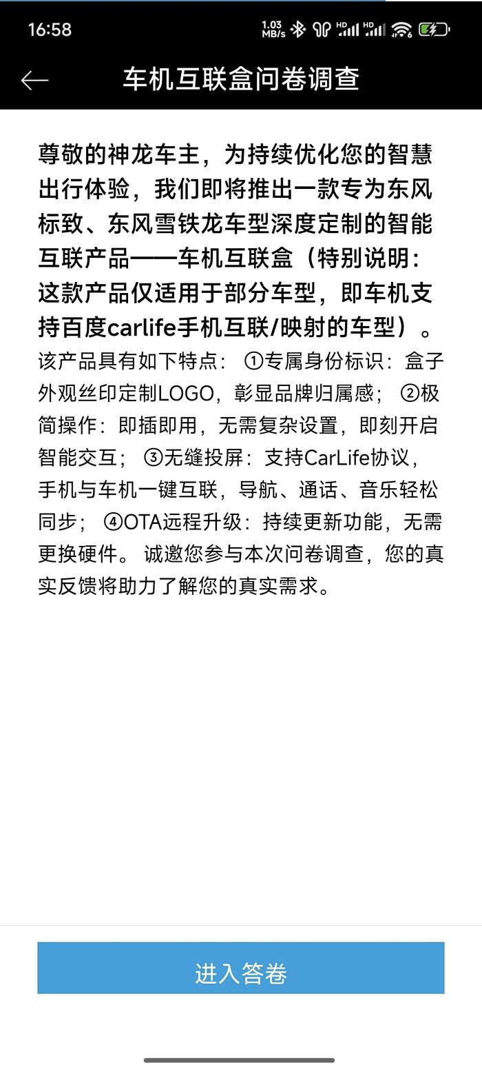 置换标致408x差不多十一个月了,大家一直吐槽车机系统的车机互联问题,苹果的手机系统可以直接无线连接车机,但是安卓系统的carlife就需要用有线连接才能连接车机系统,今天下午突然发现官方App更新了调查问卷,想要推出一款车机互联盒子,以下是推送内容: