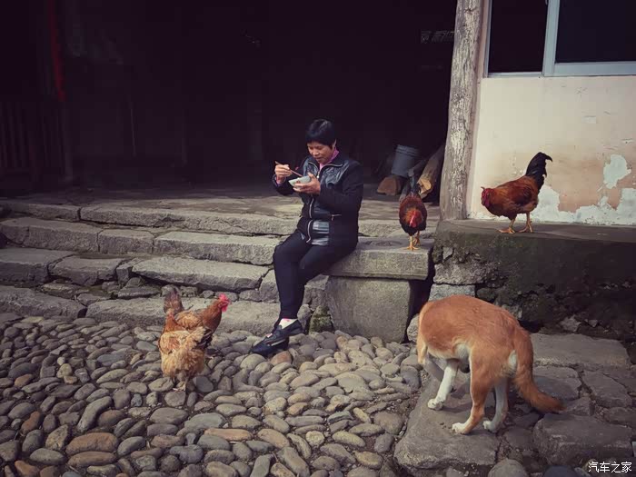 村民坐在门口吃午饭,时不时会给狗狗两块骨头。