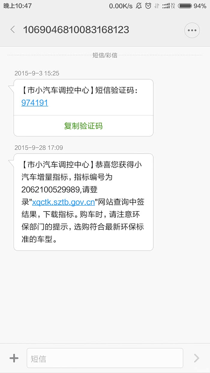 买车原因:一次出差途中,跟同事聊天,深圳买车要摇号,概率很低,竞拍要两三万,可以先摇号,中了挂在一辆二手车上,要买新车的时候换过来,想想也有道理,于是9月3号,我在网上申请摇号了。9月28晚上,跟我一样屌丝的几个同事在一起砌长城,突然收到一条短信,我竟然中标了,第一个月我就中标了!!!此前28年一直没有中奖运,每年公司的抽奖,各种供应商活动的抽奖都没中过,这次一下有点接受不了,我的天啊,,,另外几个雀友都不敢相信啊