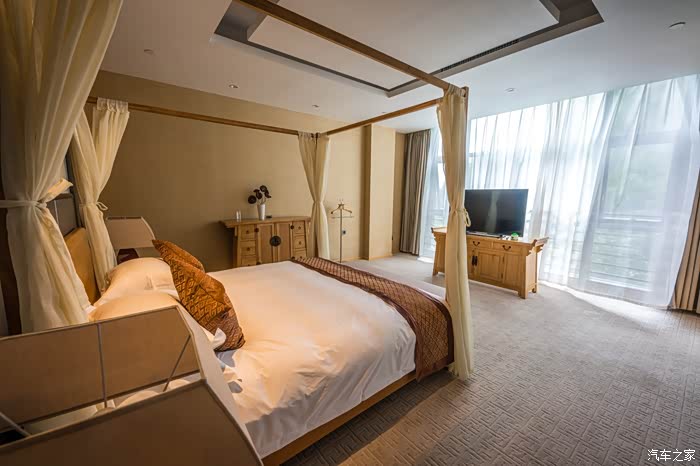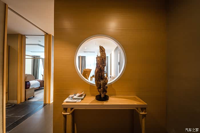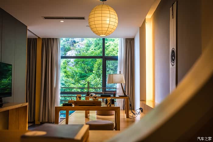 到了房间,推开门映入眼帘的是一扇屏风,一袭木制假山立于正中,半遮半掩间让人对后面的风景更为期待,拉开窗帘,落地窗采光很好,也很好的融入了窗外的风景,让人欣喜,加上之前台人员的细致热情,这里给人的第一印象很不错,内外兼修啊!