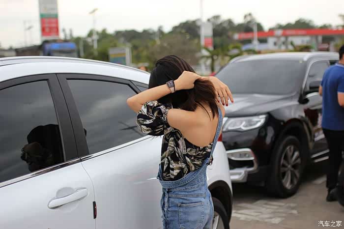 我们在高速的一个服务区停了车休息片刻,随行的旅行家小姐姐对着车窗的镜子整理起头发。