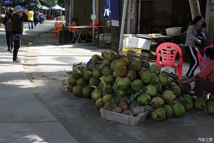 在饭店的周围到处是成堆的椰子,来海南不用喝水椰子可以当水喝,给大家普及一下关于椰子的知识,真假不知道反正是当地的司机大哥告诉我的,可以当作参考:1,椰子不要早上喝,早上喝不甜,不要问为什么,我问过司机大哥也不知道。2,椰子分青椰子和老椰子,青椰子口感有点涩,老椰子比较甜,大家购买时要说买老椰子。3,椰子按颜色分青椰和金椰,金椰口感比青椰好。4,推荐海南水果市场那种小个的牛奶椰,口感甜而且有一股淡淡的奶香味道。