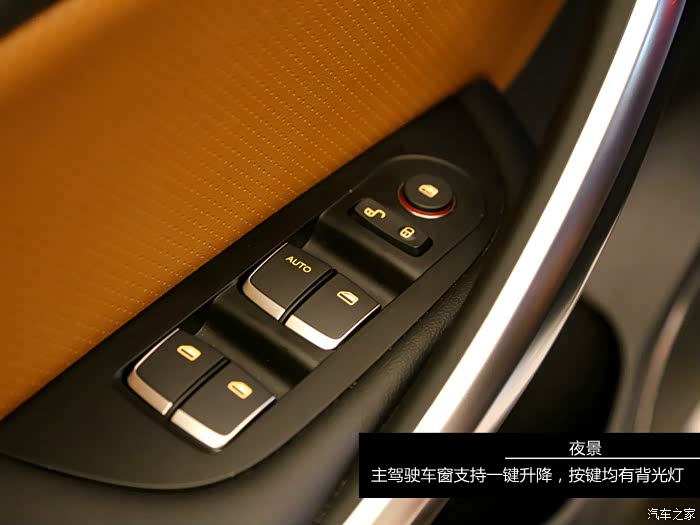 ▼主驾驶席车门内侧按键全部带有背光灯,中控锁 支持起步自动上锁,车辆发生一定程度碰撞时,四门车锁会自动打开,车内的人能够在第一时间迅速脱险