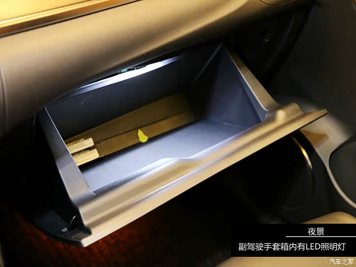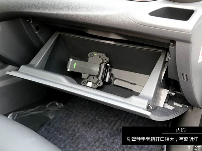 ▼副驾驶手套箱开口比较大,也有LED照明灯,可以放一些体现较大的东西,比如我的单反相机就能轻松放进去