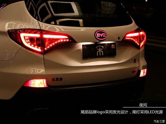 ▼后尾灯采用LED光源,夜间辨识度非常高,高位刹车灯也是LED光源,处处体现了比亚迪出品