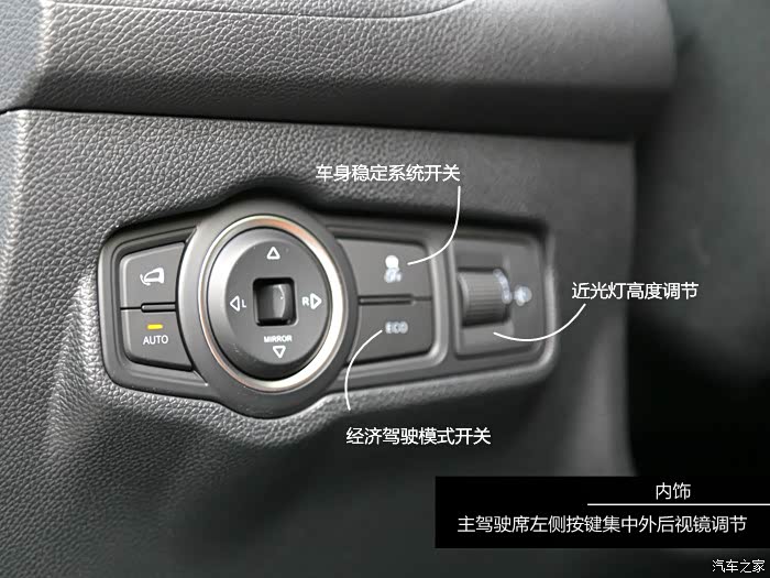 ▼主驾驶席左侧控制区集中了后视镜调节按键,车身稳定系统开关,ECO键是经济模式开关,如果对近光灯高度需要调整,可以通过旋钮来实现微调