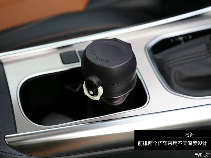 ▼主副驾驶席之间的杯架设计算是一个亮点,两个杯架采用不同深度的设计,如果喝矮瓶的水,比如红牛,可以放浅的杯架里,如果使用高瓶喝水,可以放深一点的杯架里,避免晃动,也不影响手臂放扶手箱的舒适性
