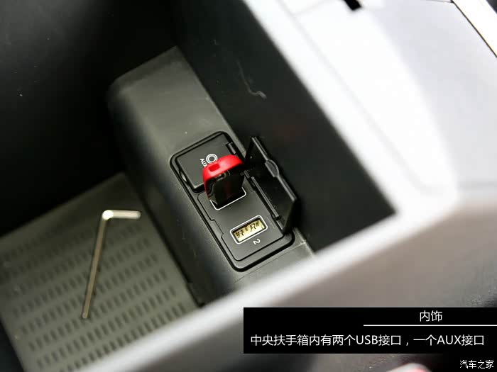 ▼中央扶手箱盖采用真皮覆盖,对手臂支撑感不赖,遗憾的是不能前后移动,掀起箱盖,里面有两个USB接口,一个AUX接口,方便插U盘听歌的同时利用另外一个插口对手机充电