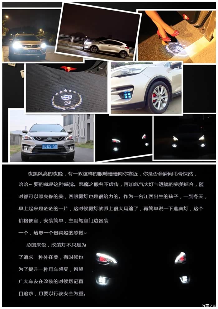 从购车到现在,陆陆续续改装各种项目已经数不清有多少种了,每项改装都带来的是快乐。几乎所有的人都说为什么不换一个好些的车,而只是不停地改装。其实道理很简单:我比较喜欢玩车,不太喜欢单纯开车,想想干脆给自己的前面改装做一个小总结,也好为下一步改装澄清道路。从前到后一直沿着外观的改装的路线走,而我想追求一种装比于无形之间的境界是:外观必须是很拉风的、车内的人听着劲爆的音乐,但是提速又很猛,提速时排气发出那种声浪的感觉就好了,但是呢!这些都只是心目中的追求而已,毕竟GS的动力是不允许的!!只能在外观上面小改一下,话不多说,上图大家欣赏吧!!