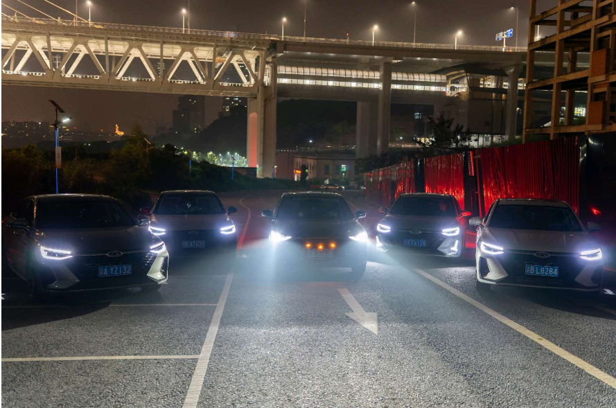 雾夜+车灯=自带氛围感!五辆奇瑞并排开着灯,连地面的反光都成了加分项,车友群里已经在抢这张当头像了~