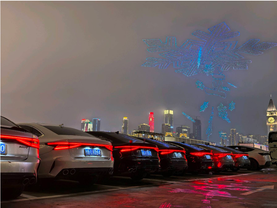 “刚把奇瑞停好,朝天门上空突然飘起'无人机雪花'!蓝莹莹的光裹着渝中夜景,和车尾灯的红光搭得刚好,这运气谁懂啊~”
