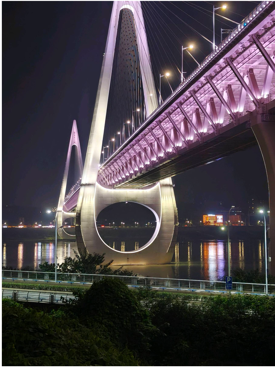 “重庆夜场的'赛博地标’已上线!白居寺大桥这抹粉紫灯光,像给夜空开了个未来感滤镜,站在江边抬头看,桥塔的圆环都像星际之门~”