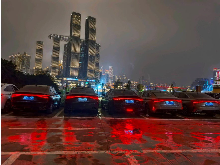 “朝天门的雨雾把夜景揉成了柔焦滤镜,奇瑞的尾灯一红,直接成了画面里最亮的'锚点连地面的水洼都跟着blingbling~”