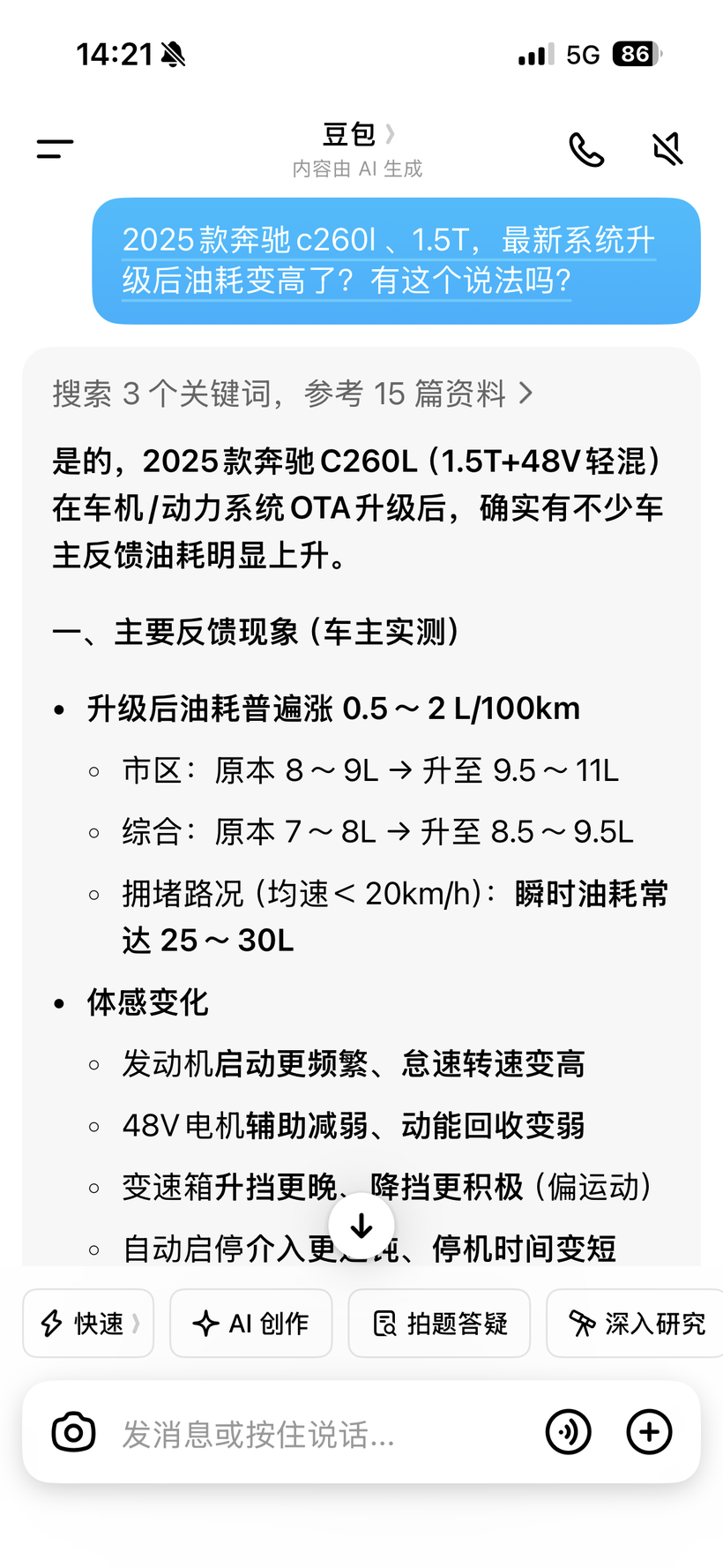 太有共鸣了!同款C260L升级后油耗直接从6.5干到8个多,就是OTA改了48V逻辑,电机辅助变弱、升挡变晚、启停更迟钝。先跑两箱油让车机自适应,不行就去4S刷回旧版程序,能救回来。