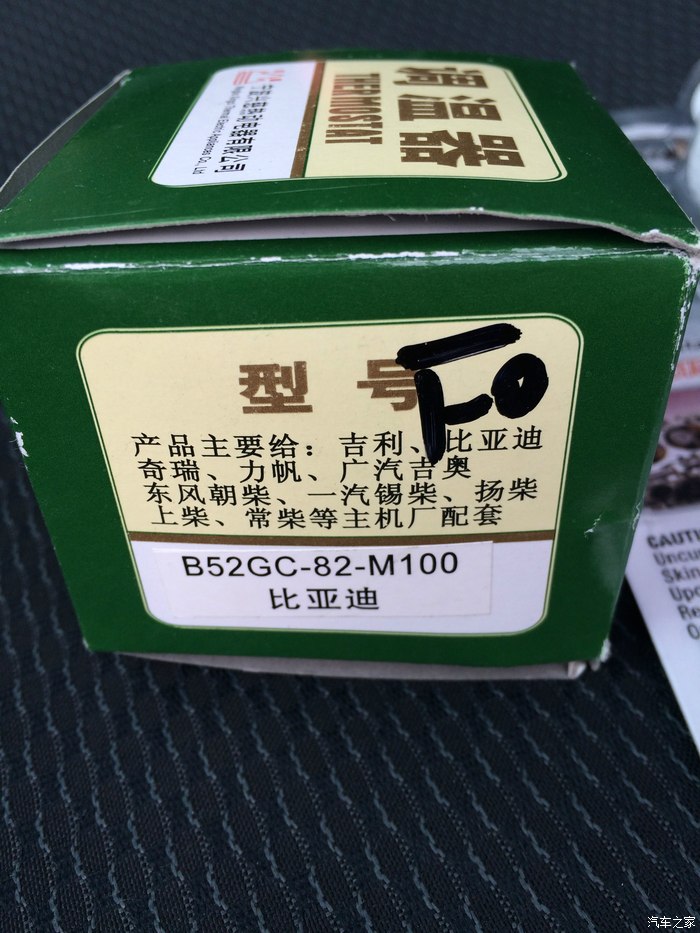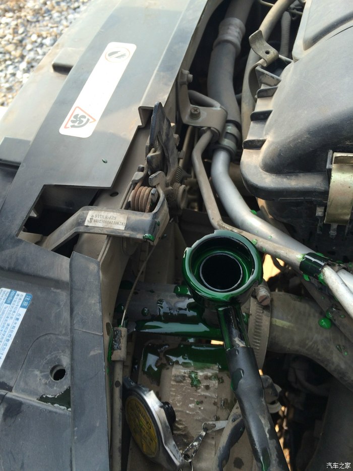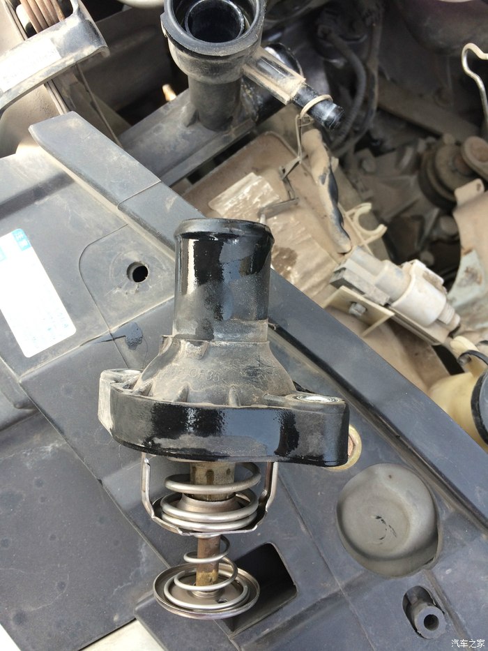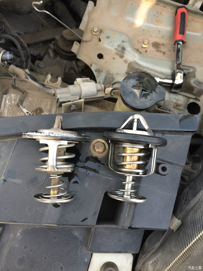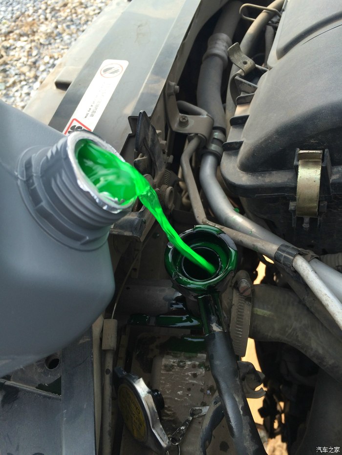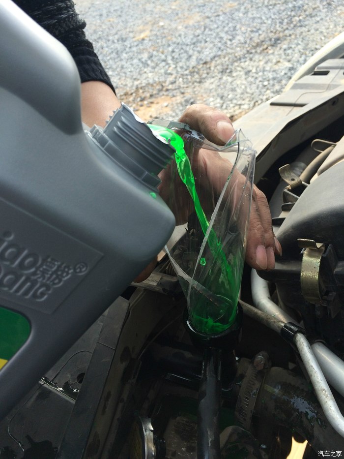 找个塑料壳当漏斗 加完 加了 3升多 还剩点 好了到了这步就大功告成了!~开始试车,说下感受吧 前前后后跑了10几公里在一个红灯路口 发动机水温开始上来了 风扇开启 大概过个 1分钟左右 自停了 会大循环了! 我 草这成就感一下就来了! 最后说下这次费用吧 节温器25 防冻液52 密封胶 20 密封胶费用可以忽略不计只用了一点点,所以费用77块