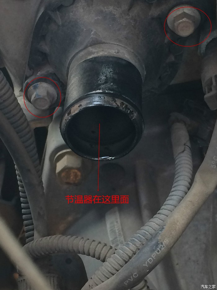 旁边两颗螺丝松掉,接口就可以拿出来了,节温器就在那里面