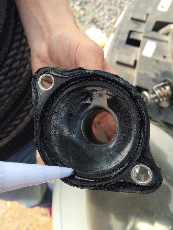 新旧对比, 开始装新的了,虽然节温器上有橡胶圈 但我对比了下 新的节温器橡胶圈比旧的橡胶圈好像 小有点 为了防止渗漏 给接口来点密封胶