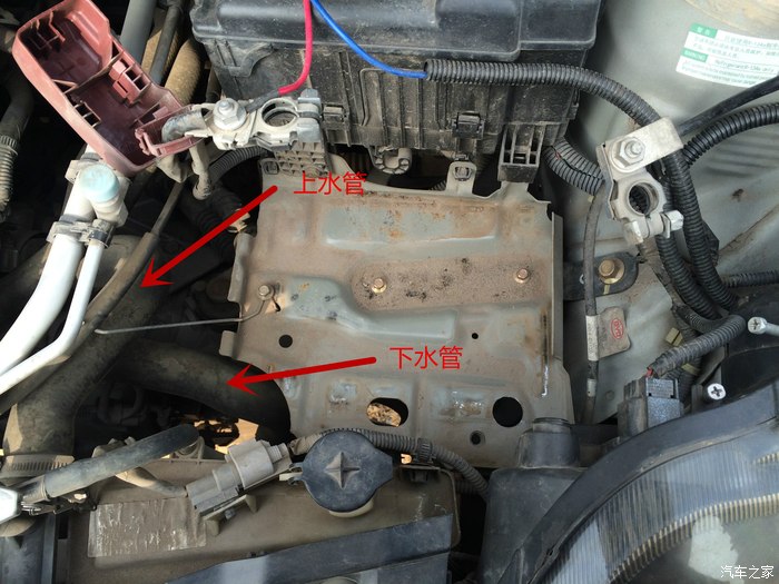 本来还想放的更彻底点,想着车转下!电瓶被我拆掉了 就算了!防冻液放完了接下来开始拆节温器了~由于蛋蛋的发动机仓有点紧凑,为了便于操作,只能把电瓶给拆了 留出更多的操作空间