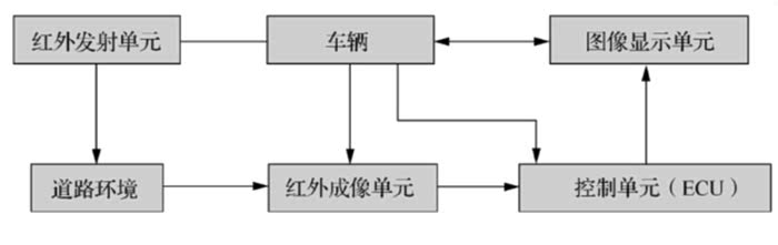 红外成像单元:主要是红外图像摄像头,记录车辆前方区域内的图像,并提供其探测范围内是否存在行人或障碍物的信息,然后通过数字视频线将数据发送给控制单元。