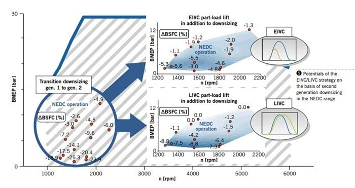 区别于液压VVT,电动VVT通过前端的电机+减速器结构进行驱动,虽然停机时电动VVT同样会回到最迟后位置,但是一旦发动机上电,电机就能将凸轮轴在起动之前快速的拖到设定的目标相位,可以理解为电动VVT能够有任意的起动相位。因为电动VVT的这种特性,起动相位就具有了进一步后推的可能。此时该发动机的进气门1mm关闭位置来到了上止点后665°CA,但是只要在起动点火前将升程曲线前移到645°CA或更提前位置,发动机就能够正常起动,而在需要665°CA相位起作用的工况,再把升程曲线挪回去就可以。这种不被起动相位限制,较液压VVT+阿特金森循环型线方案能够多用到的20°CA调节范围,就是所谓的深阿特金森。