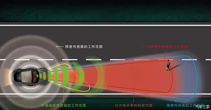主动夜视辅助系统采用主动红外成像技术,把目标物体反射或自身辐射的红外辐射图像转换成人眼可观察的图像,这种系统本身必须具备光源,不发出热量的物体也可以看到,通过图像处理提高清晰度,道路标志清晰可见。