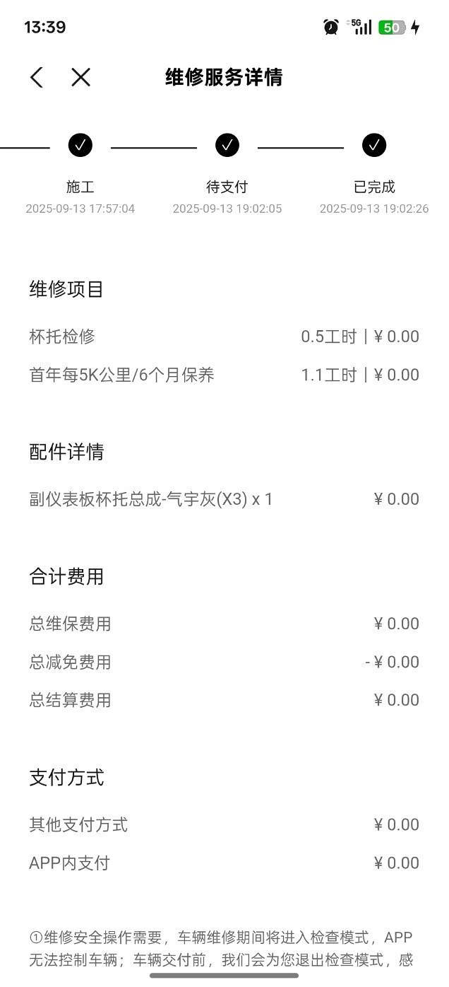 我先在大厅看了下新P7,确实很好看。以后要是增购第二台电车,我肯定把它列入目标车型考虑清单里。大概过了一会儿,服务顾问就打电话给我了,让我去售后大厅里开单。售后给我介绍了首保的内容,说厂家发布了一个服务活动——更换手扶箱杯托,这个是免费的。还真别说,我一直都没注意到有个卡托没弹出来,正好趁这次机会给换了。
