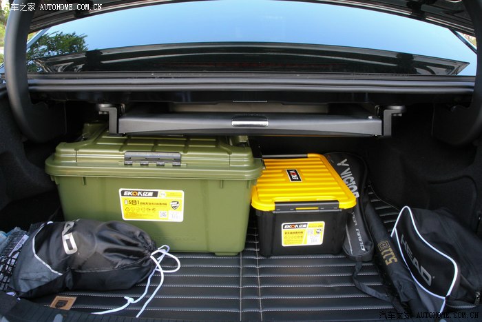 宽敞的后备箱,可参考图中的羽毛球拍长度。电动后备箱用起来也很顺手,左边按钮是关闭,右边按钮是锁车加关闭,这个特别方便呀