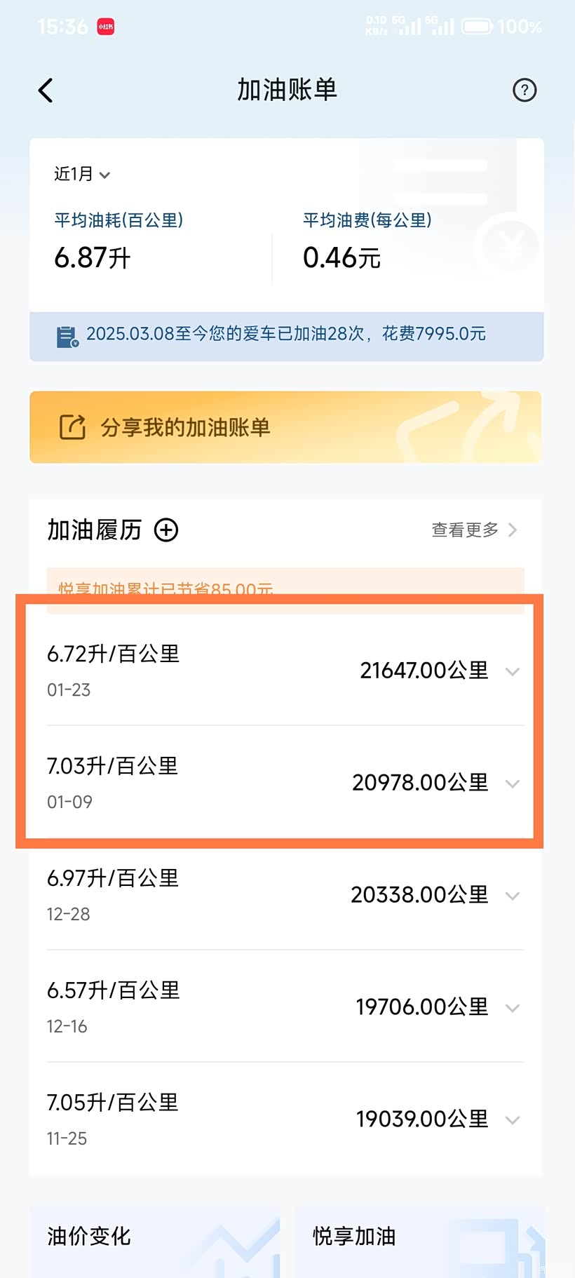 1月份的两次加油记录,记录的时候都勾选了油表灯已亮
