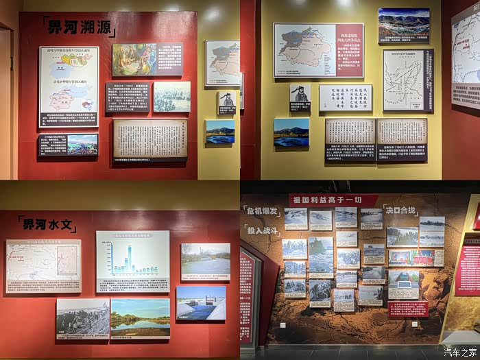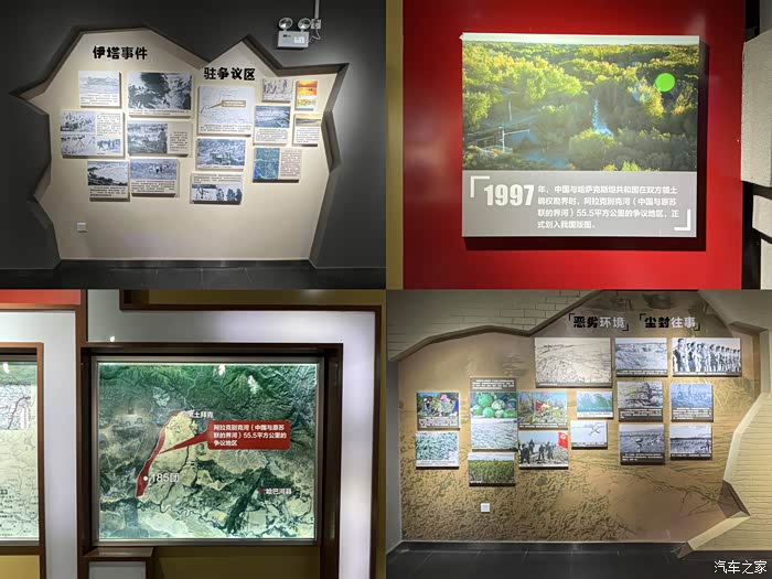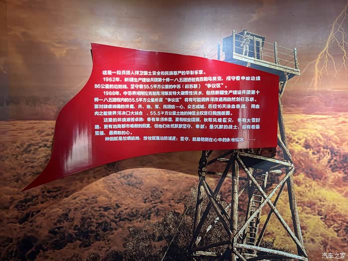 “新疆生产建设兵团第十师一八五团总面积907.95平方公里,边境线长达86公里。现有行政企事业单位16个,其中11个农业连队沿中哈界河——阿拉克别克河呈 ‘一’ 字布防。团部距十师师部北屯市230公里,距哈巴河县75公里”——摘自展览内容
