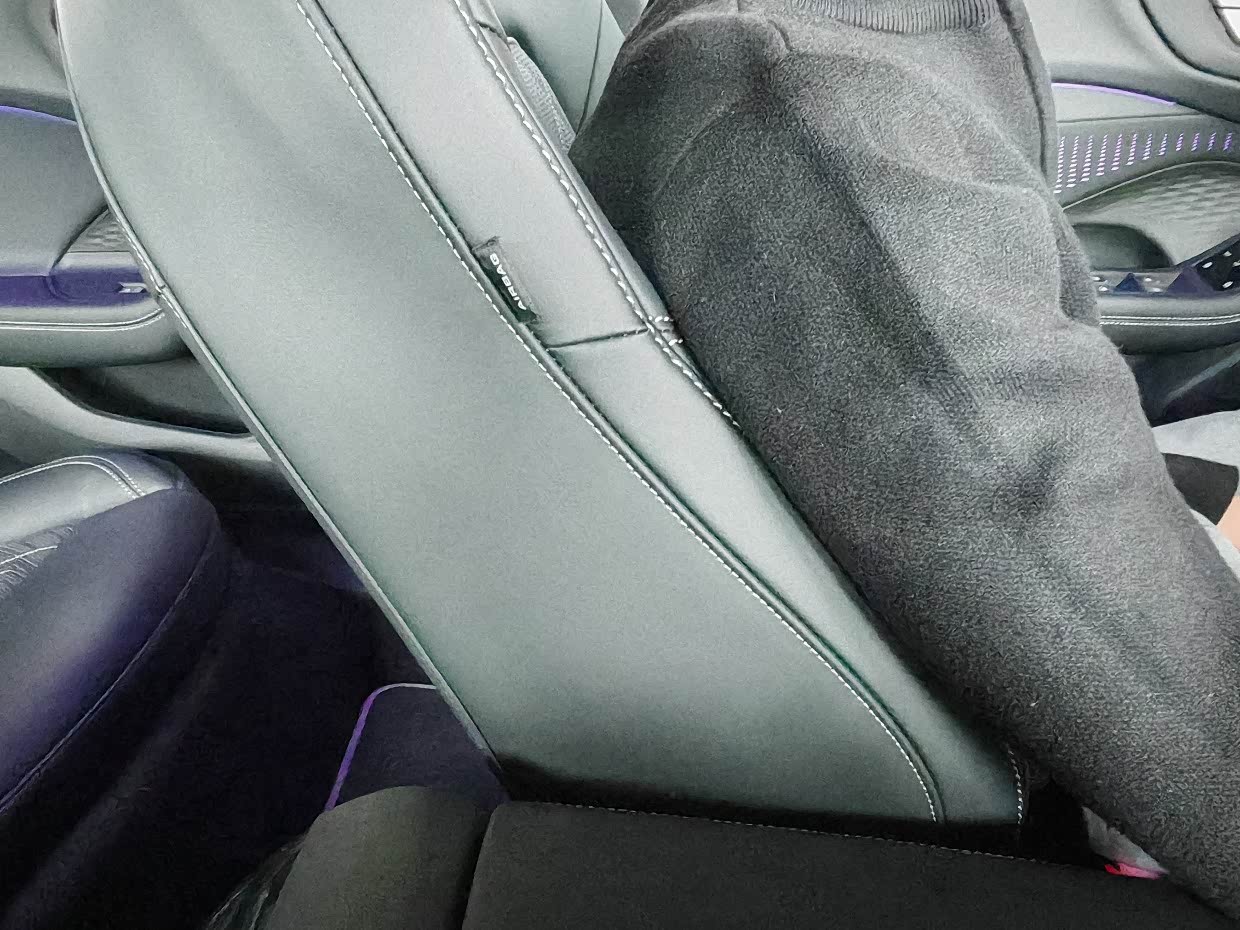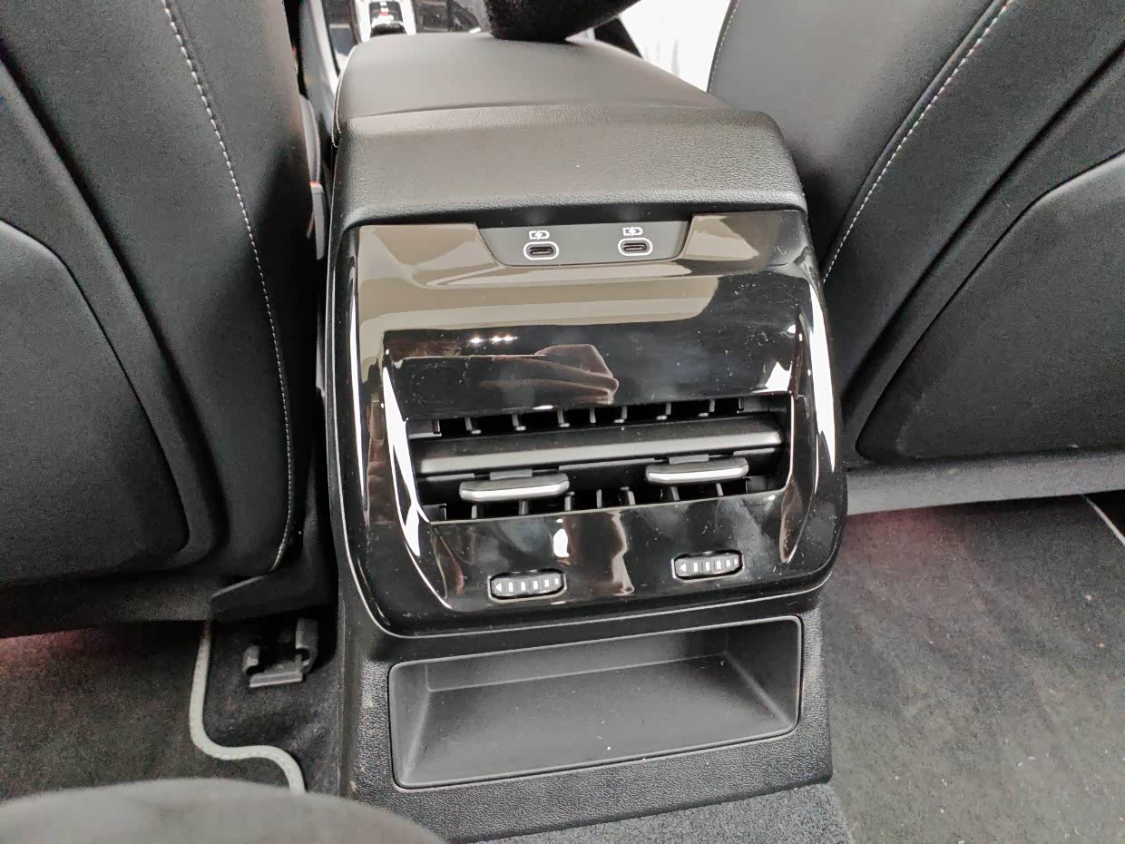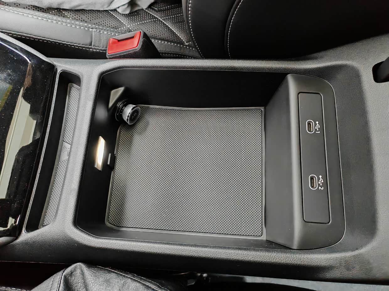 副驾驶座位还有个手套箱,可以放些文件。中央扶手箱部分:拥有2个Type-C的100W充电功率接口和1个12V的点烟器接口,扶手箱的储物空间很浅,不到10cm左右,只适合放些证件等小件物品。