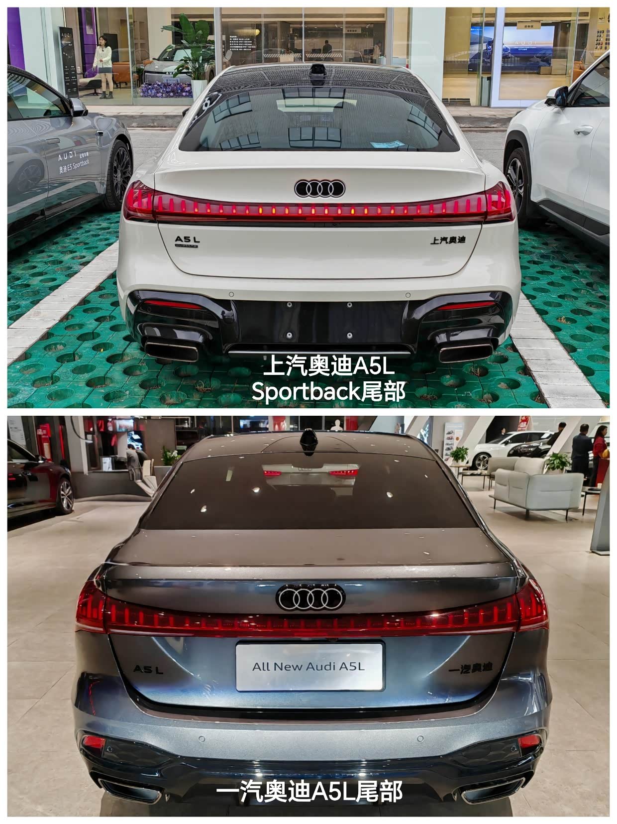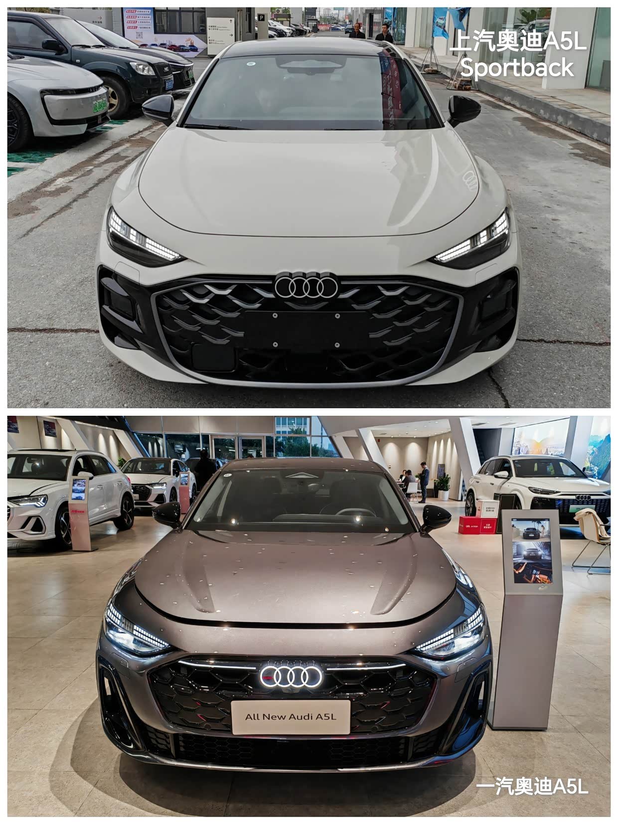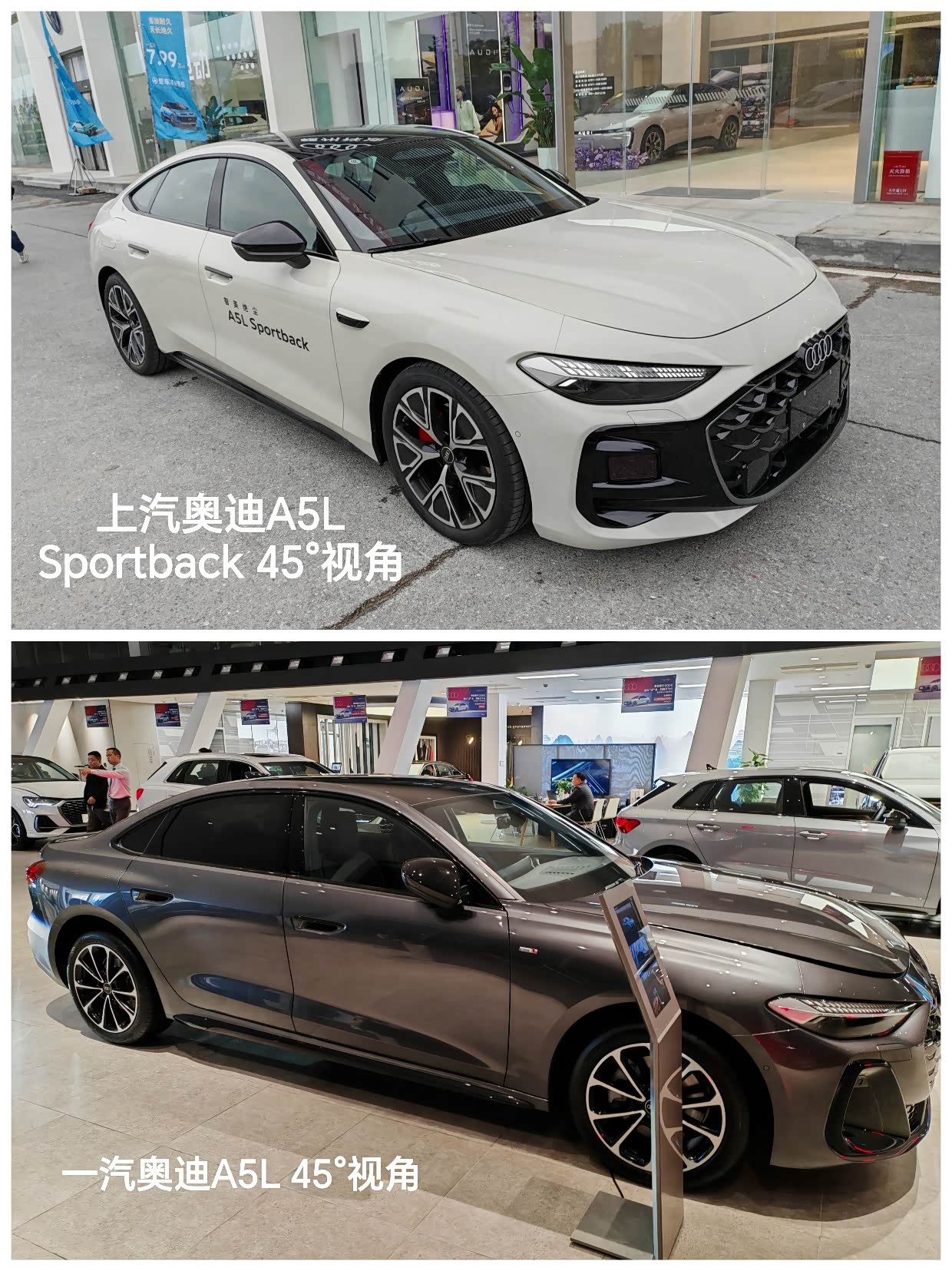 在朋友的推荐下,推荐我去看看奥迪A5L,经过我网上查询该辆车的时候,发现这款车有2个制造厂商,一个是上汽奥迪的A5L Sportback,另一个是一汽奥迪A5L,在上网和我真实探店感受来说:我发现以下不同的点:因为车的内饰配置几乎一模一样,这里不再赘述,最大的区别是外观、智能辅助驾驶的有无、底盘韧性的调教。