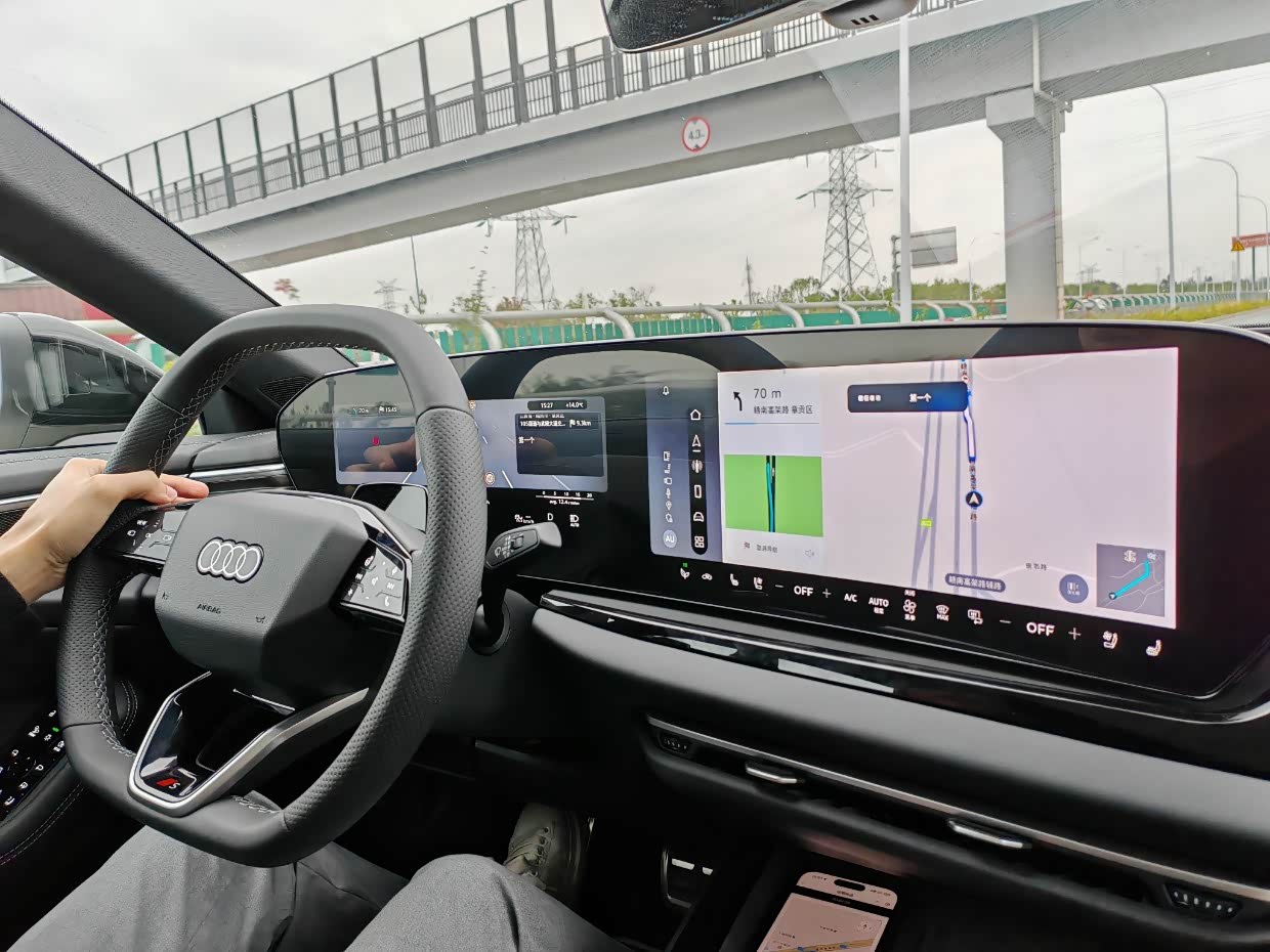 车机系统是奥迪自己研发的,界面比较朴素,没有过多的色彩,它支持Carplay,对于苹果手机的用户来说是福音,整体使用起来还是比较流畅的,但在语音识别这块,可能不是很准确,并且大部分情况下,车主得说的一字不落的才能调出它的功能,并不能根据语音模糊识别识别判断,与其他新能源品牌还是有一定的差距的。但这车的亮点在于智能辅助驾驶,这款车是奥迪油车第一次与华为的智驾合作,采用了华为的乾崑智驾方案。