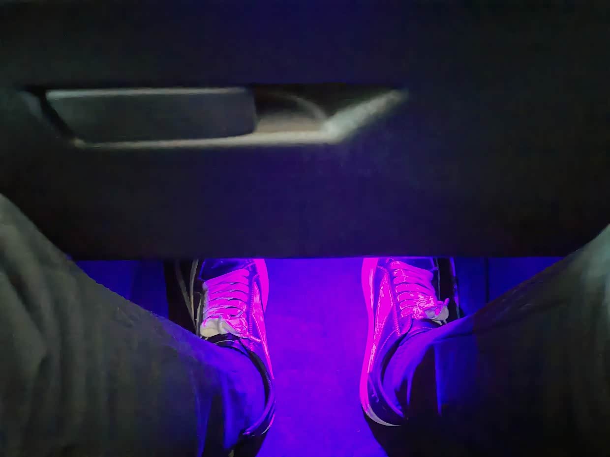 车门镀铬饰件中间有细长的氛围灯带,在停车时候,放脚处有对应的的颜色与之呼应, 在晚上开车,氛围感十足。
