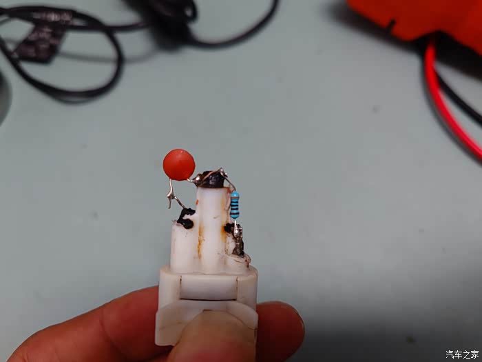 大概能看到里面只有一个电阻,一个电容。通过图片能看出电阻生锈严重,应该就这里坏了。用万用表量了一下电阻芯的阻值为2.2K。瓷片电容不知道被我拆碎的还是原来的碎了,也看不到参数了。电阻我没有2.2k的用了个3K的代替,电容就用104的瓷片电容。
