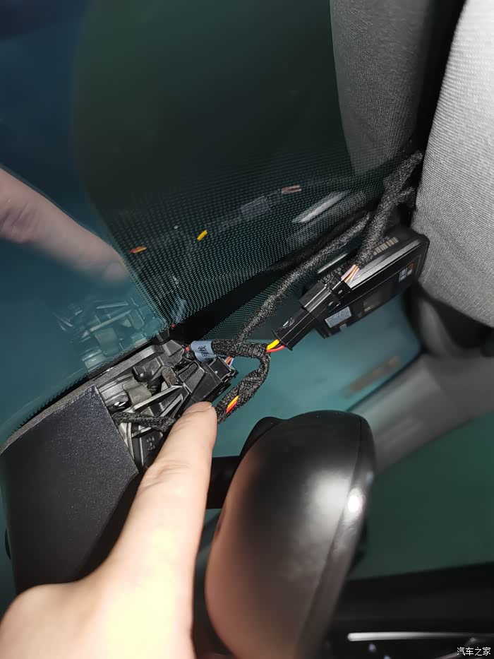 接下来就是接线了,我这个是从雨感上取电的。先把原车雨感插头拔下来就好,然后对插到行车记录仪上就行了,专车专用的,子母接头对插就好