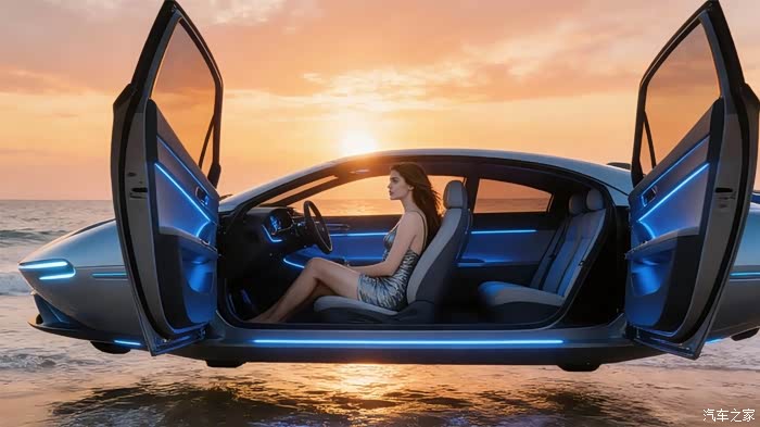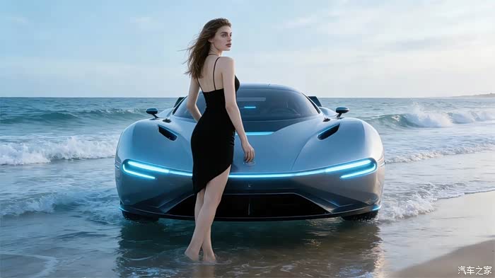 先来介绍一下我的神车。它是可以在天上飞行也可以在水里穿梭的神车。它的车身像一枚被深海洋流打磨了千年的晶石,哑光金属漆面在晨光里泛着珍珠母贝般的虹彩,从车头到车尾的弧线一气呵成,没有一根突兀的棱角,仿佛天生就该在风与浪里穿行。车头的车灯是一整条无缝衔接的冷光带,启动时会像呼吸般明暗起伏,如同生物的脉搏。座舱采用整块曲面穹顶玻璃,经过纳米涂层处理,既能隔绝紫外线,又能在潜航时自动切换为透视模式,让海底的光影毫无保留地涌入车内。