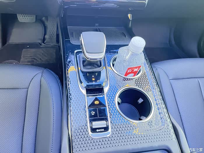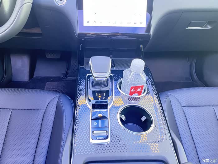 换挡机构是精致的电子挡把,旁边是驾驶模式选择旋钮(纯电/混动/智能等)、自动驻车和电子手刹按钮。